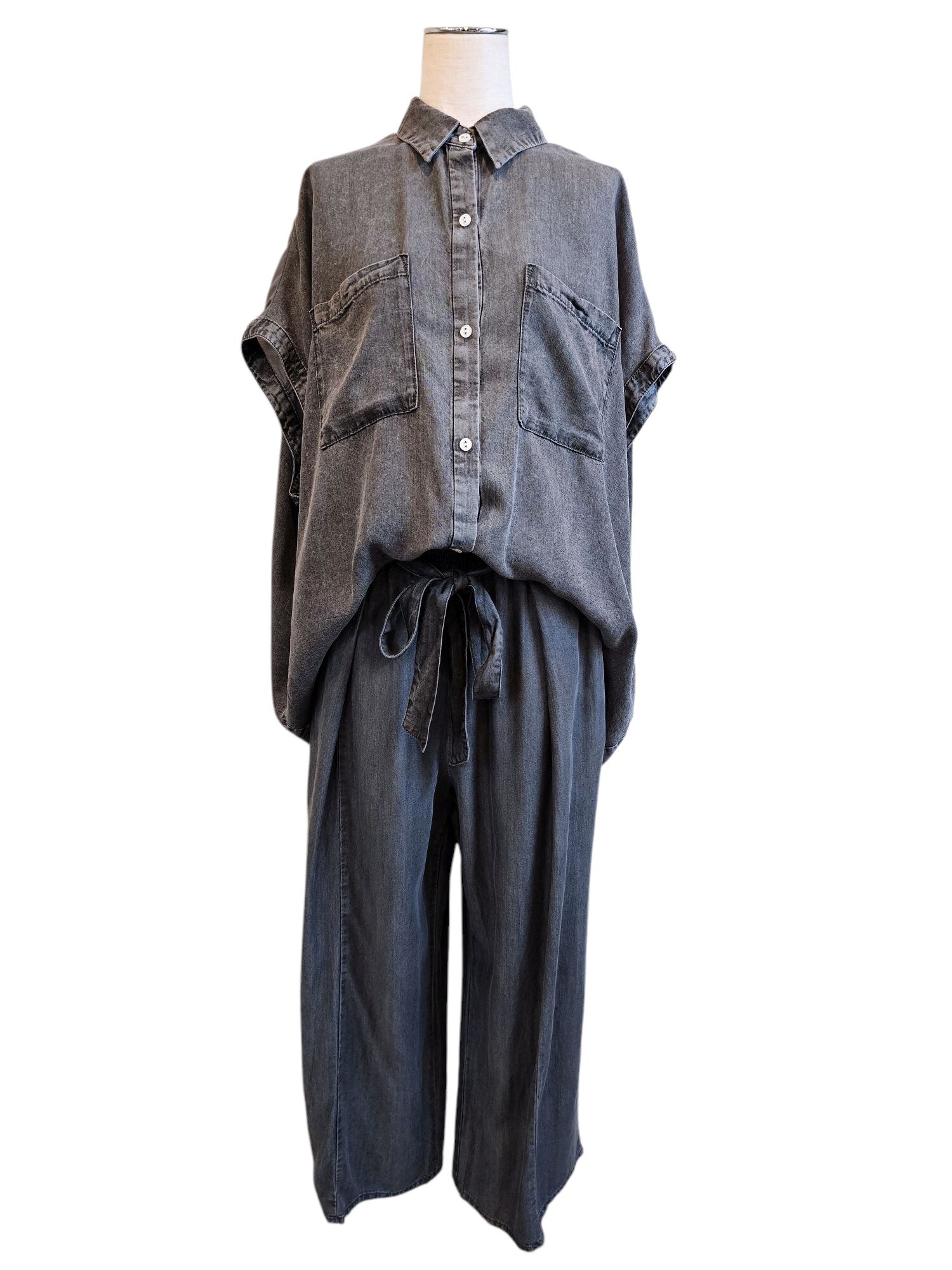 同じく【CYNICAL】のテンセルデニム×ジョーゼットシャツとセットアップとしても着ることが出来ます。