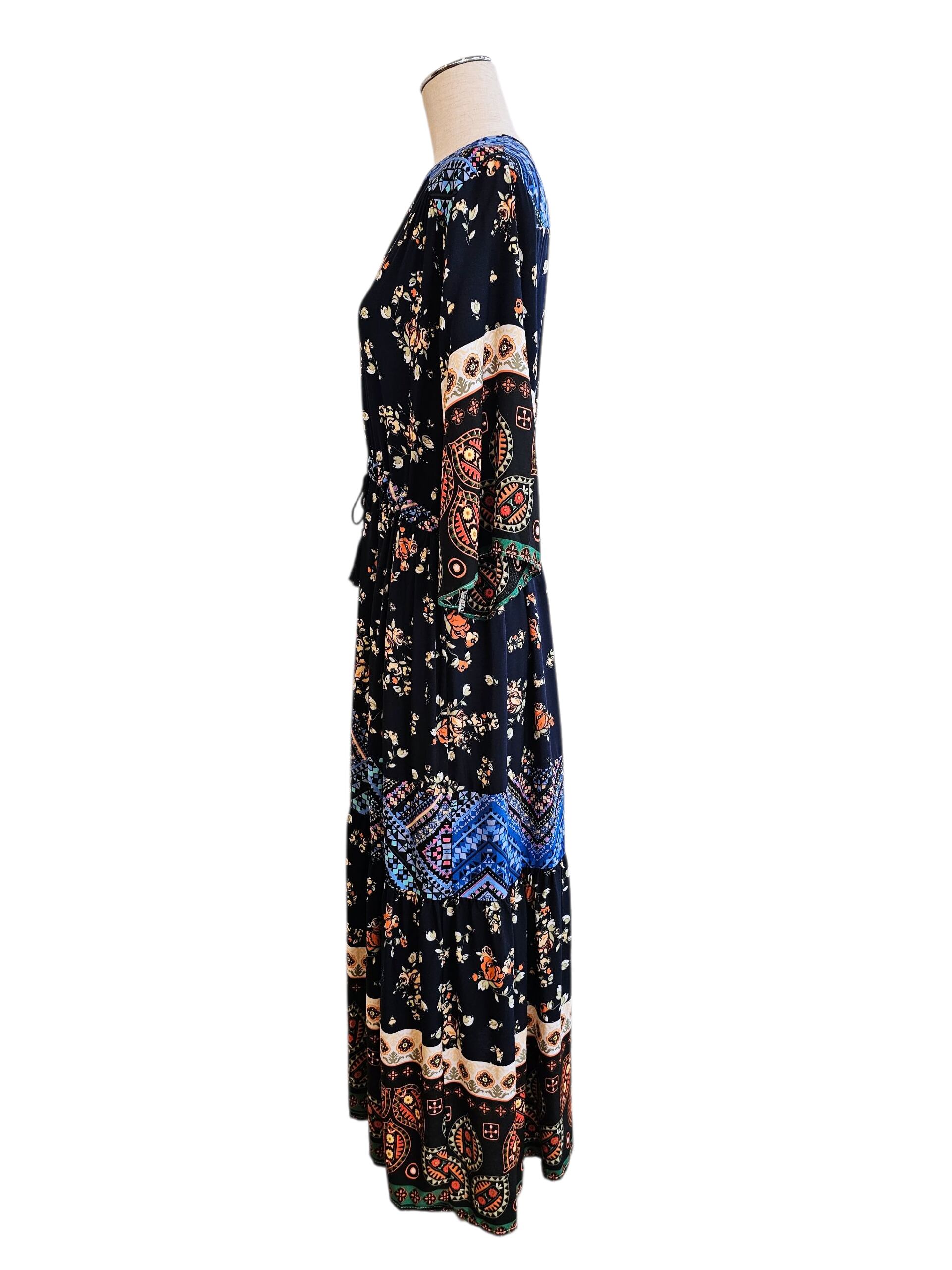 ネイビーベースに多彩なエスニックモチーフを組み合わせた贅沢なパッチワークデザインが、異国情緒漂う印象とトレンド感を同時に演出してくれます。