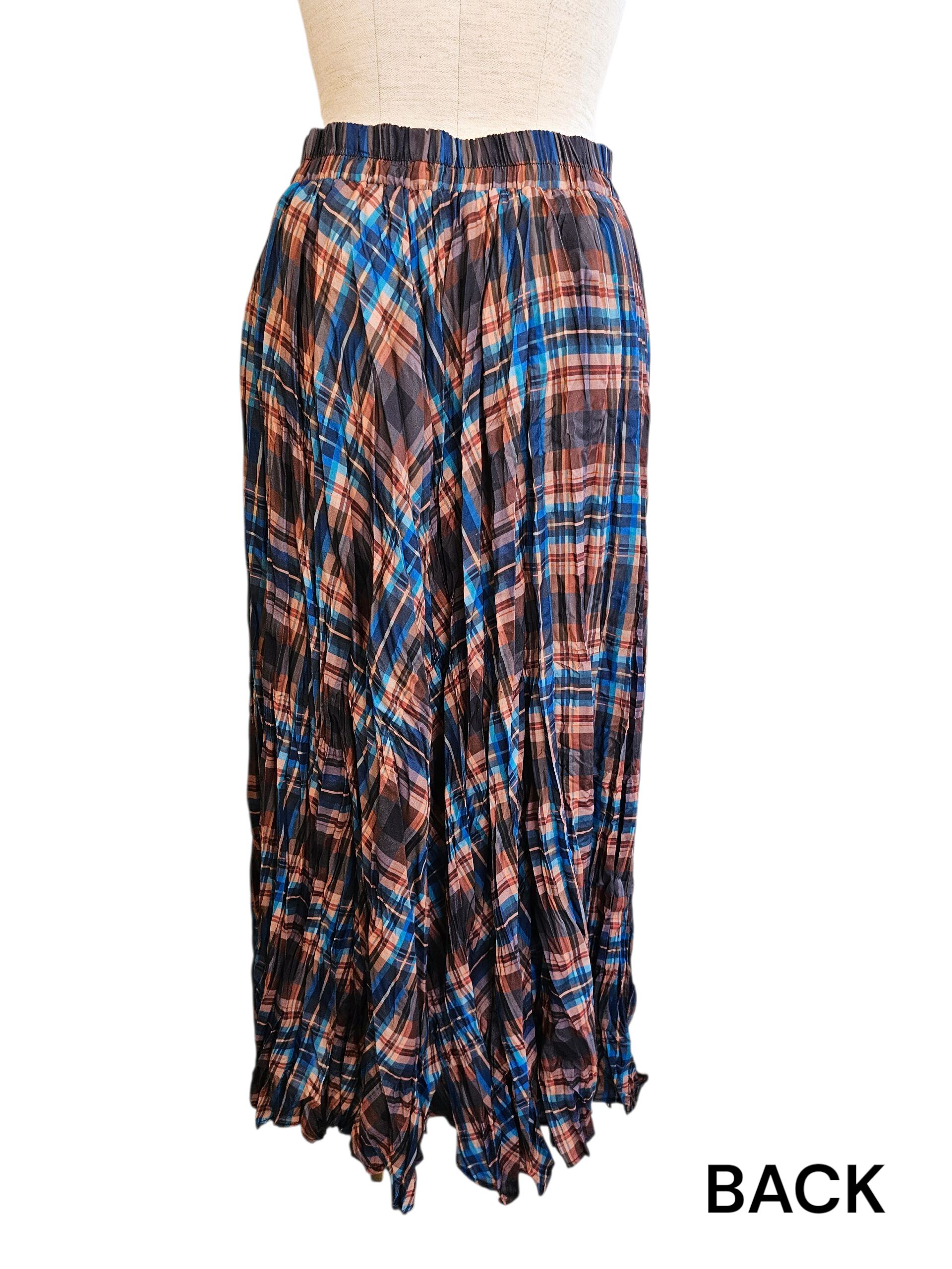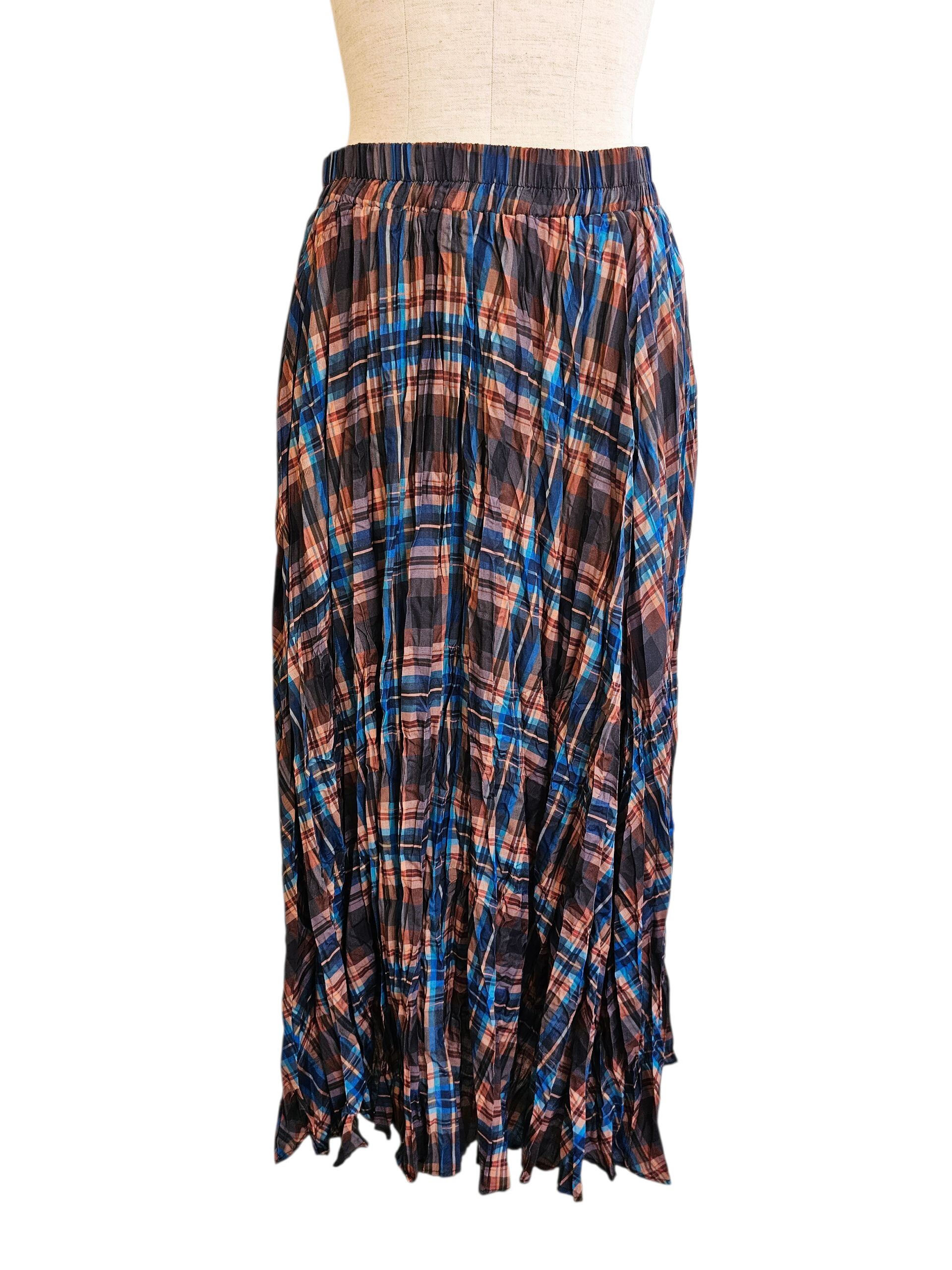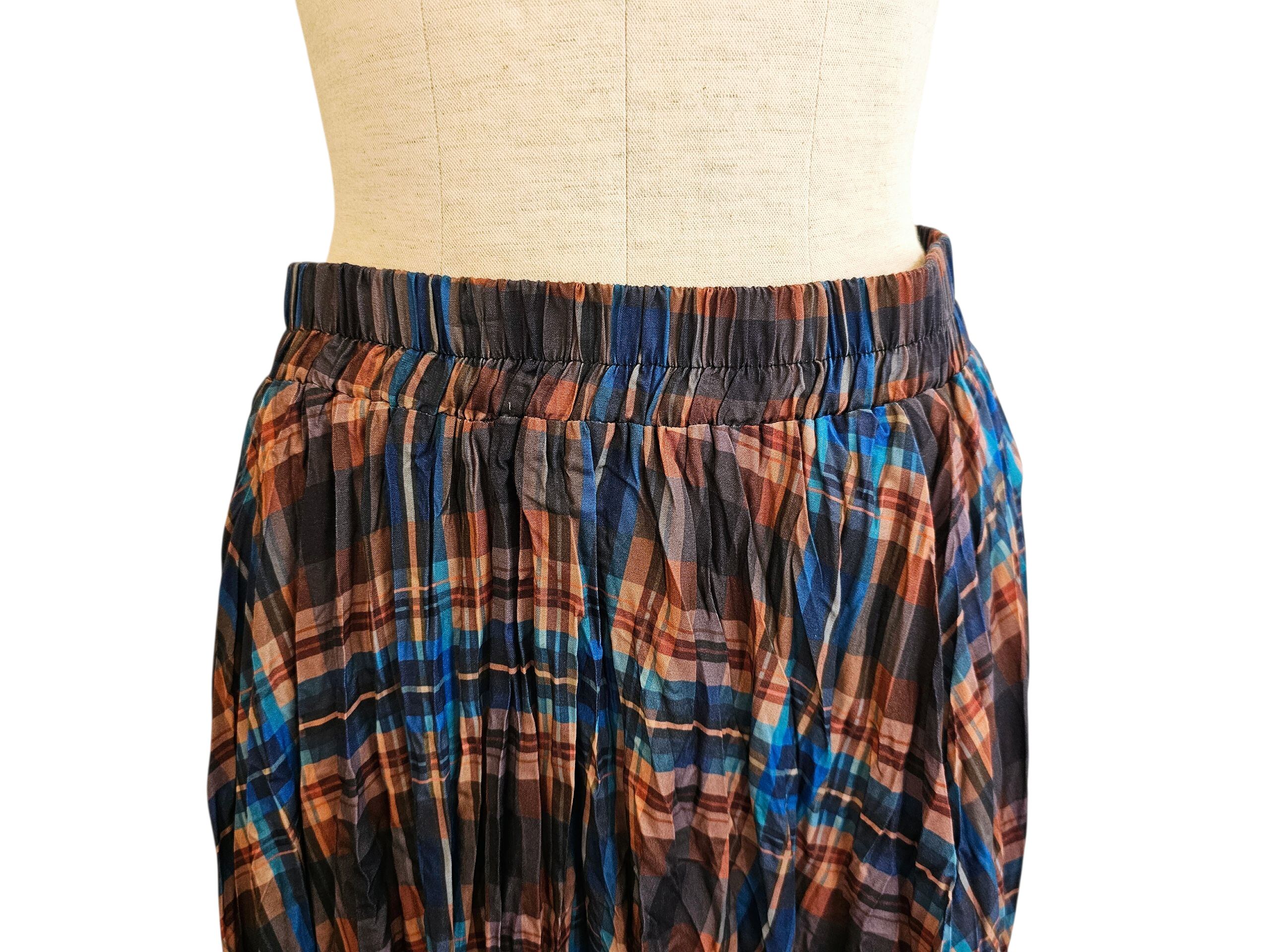 ブルーとブラウン系のギンガムチェックがとても可愛いシワ加工のスカートです。