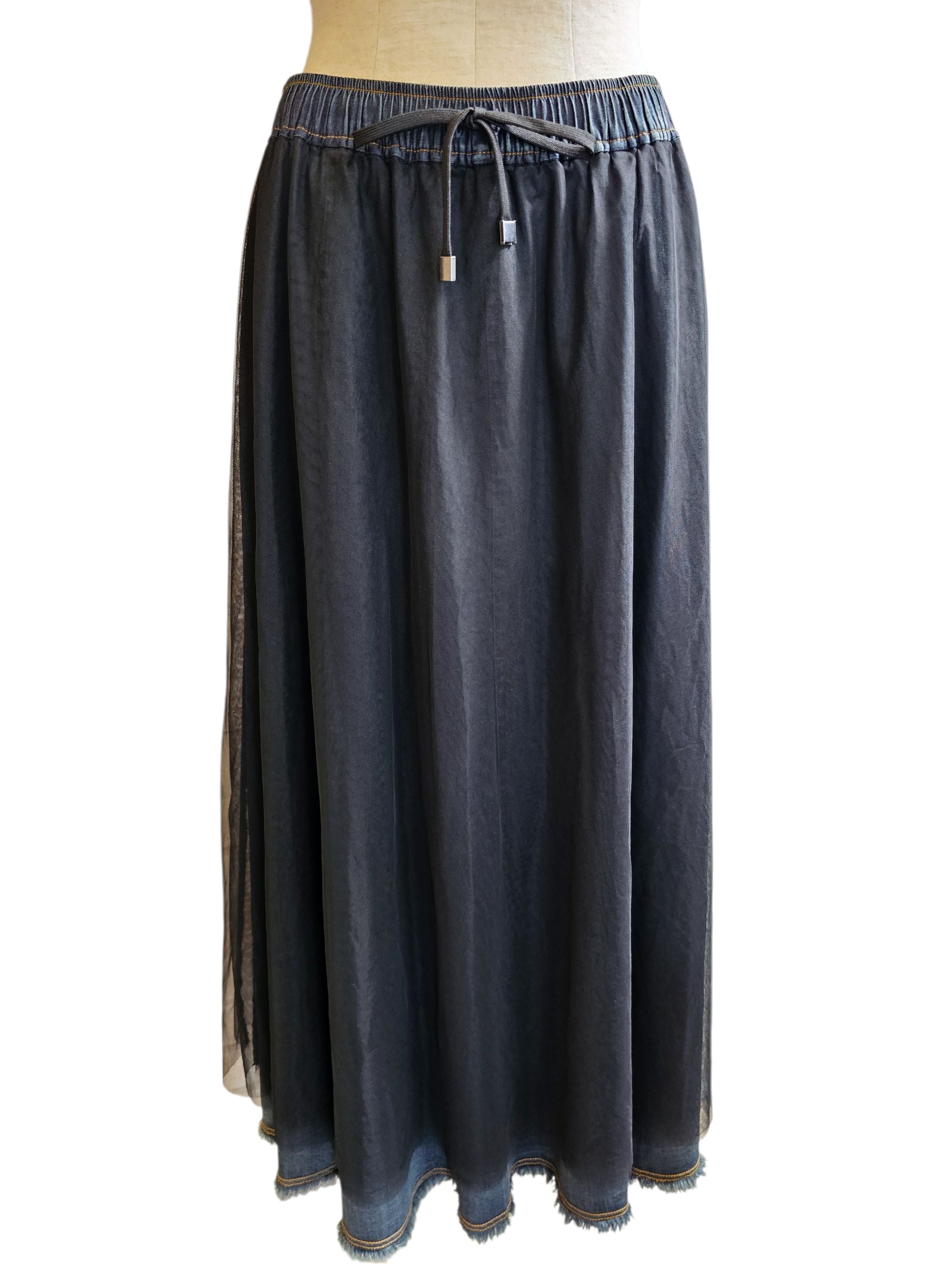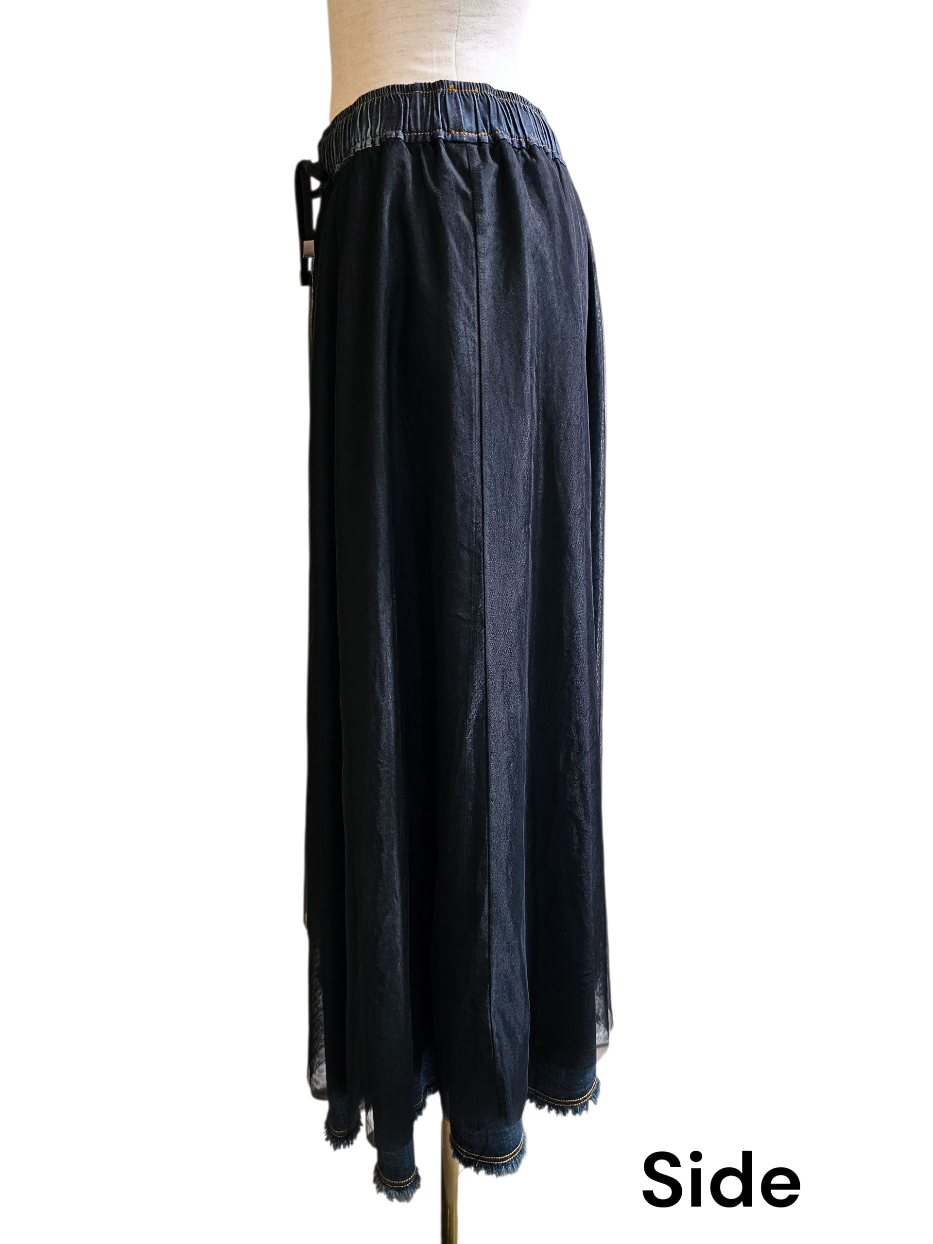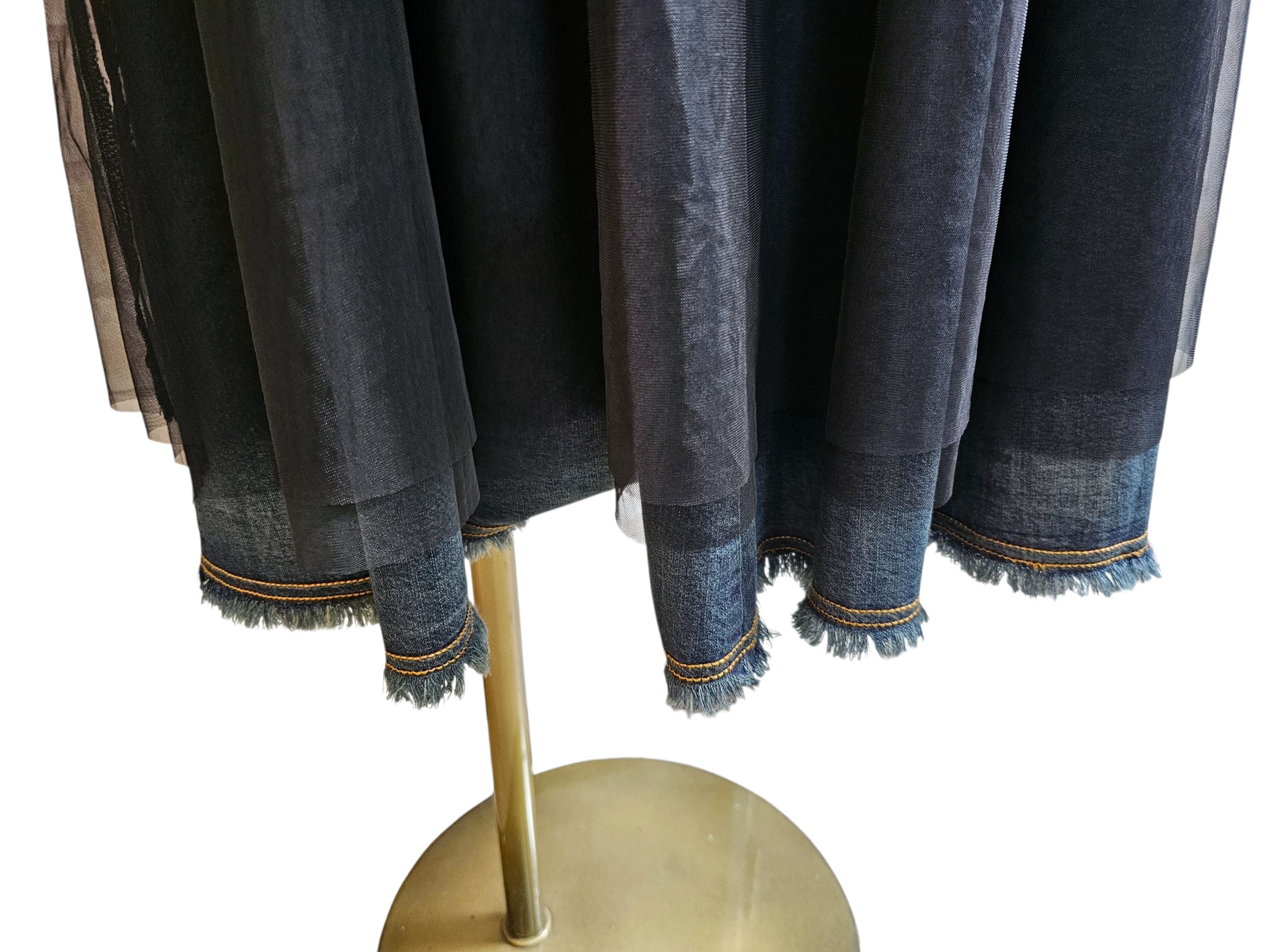 柔らかいダンガリーデニムスカートの上にブラックカラーのチュールが付いた、上品で素敵なスカートです。
