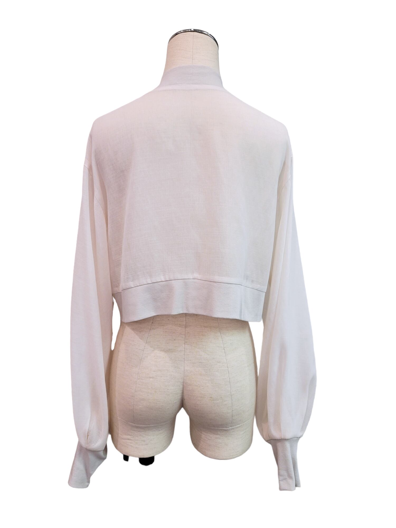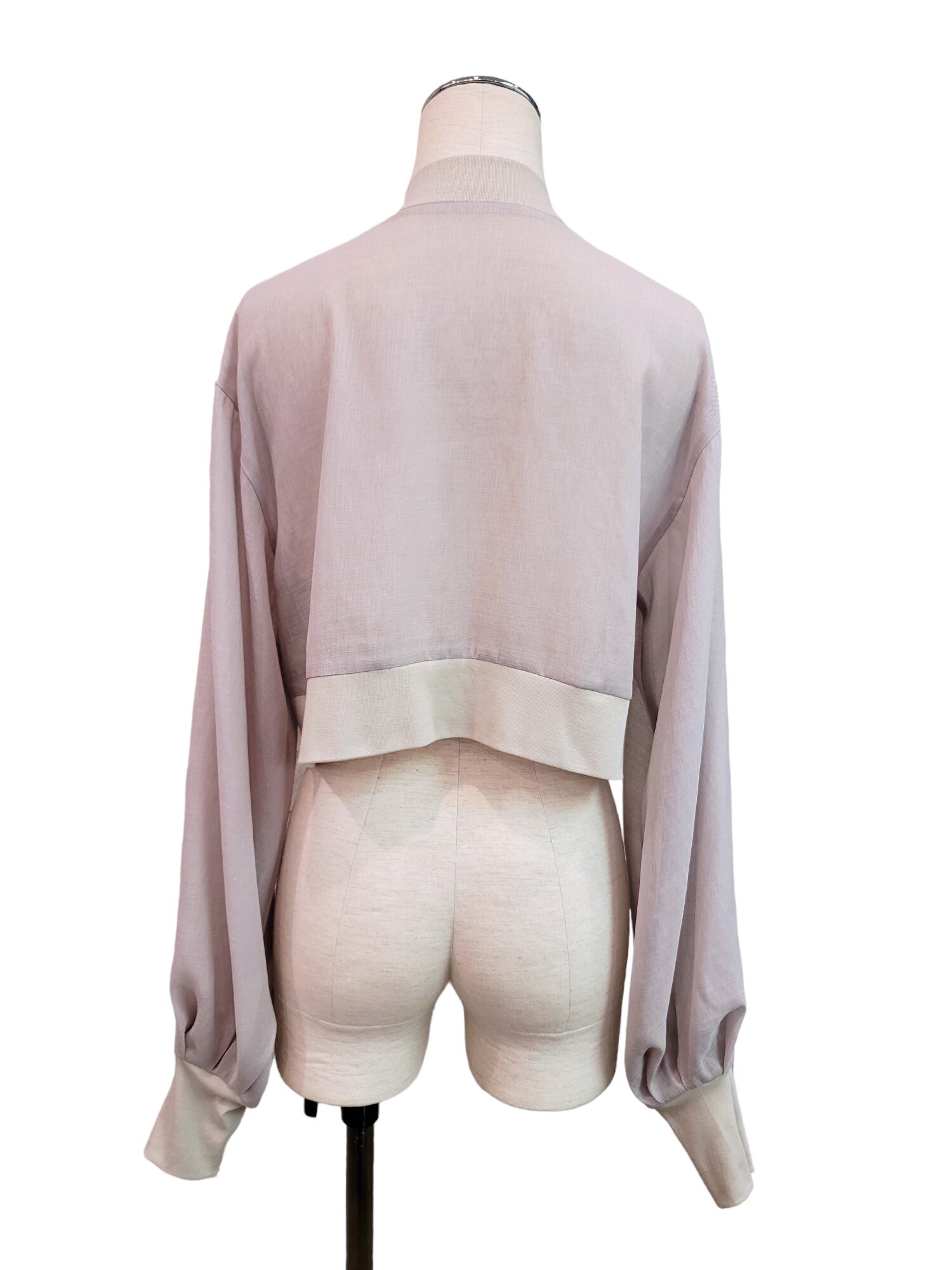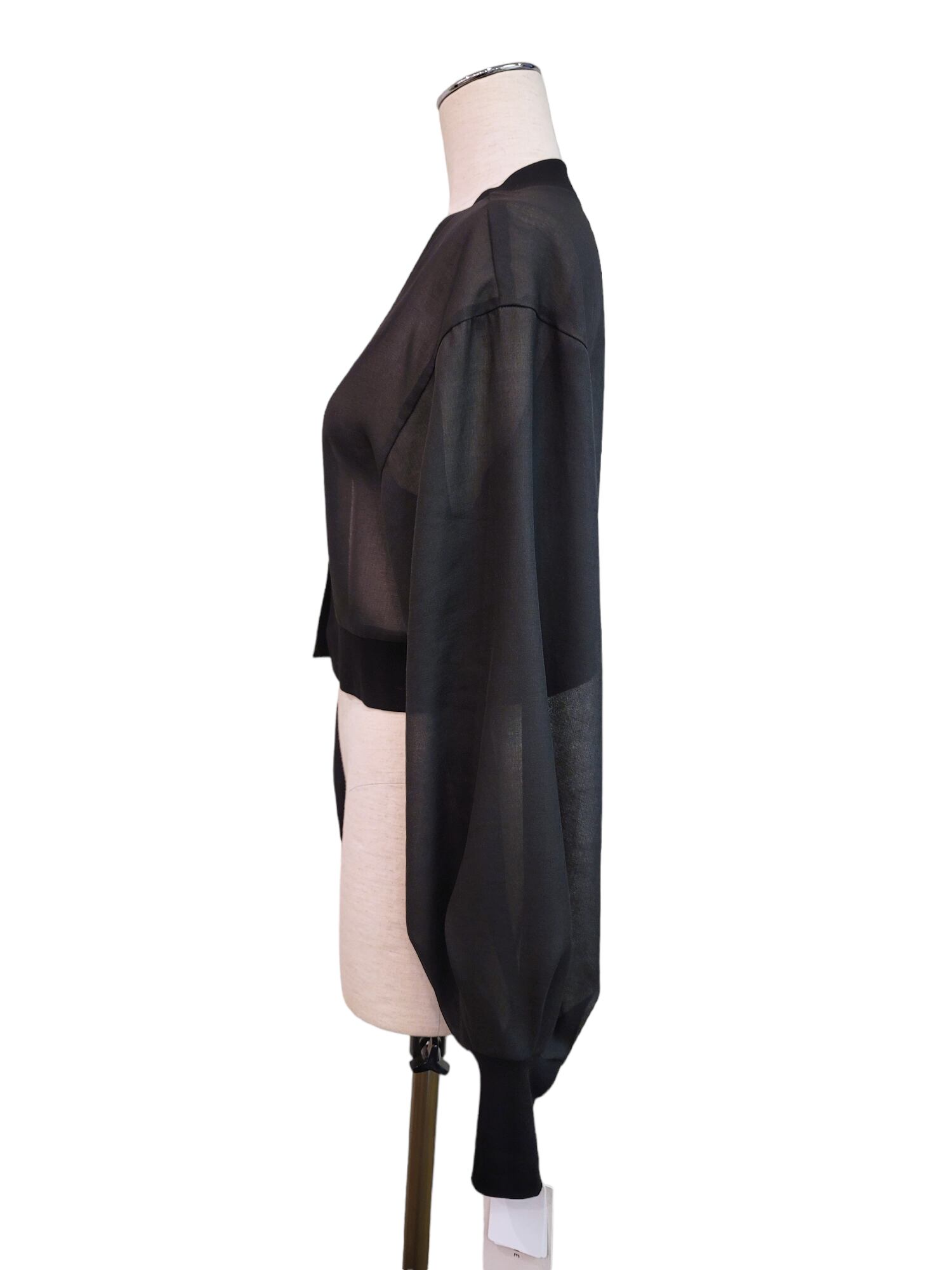 リネンライクなサラッとした生地感をポリエステルと綿で表現した、人気のシアーな透け感のボレロです。